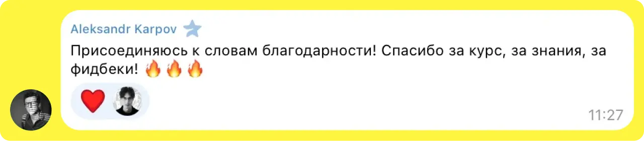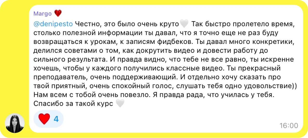 тебя ждёт особая атмосфера — 4 активные недели, короткие видеоуроки, фидбэк несколько раз в неделю, ежедневная поддержка в чате