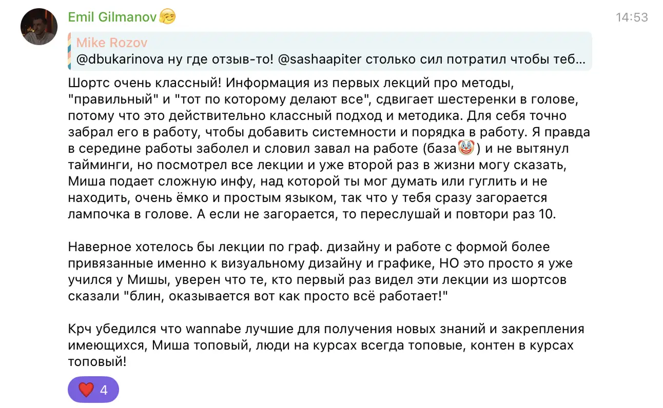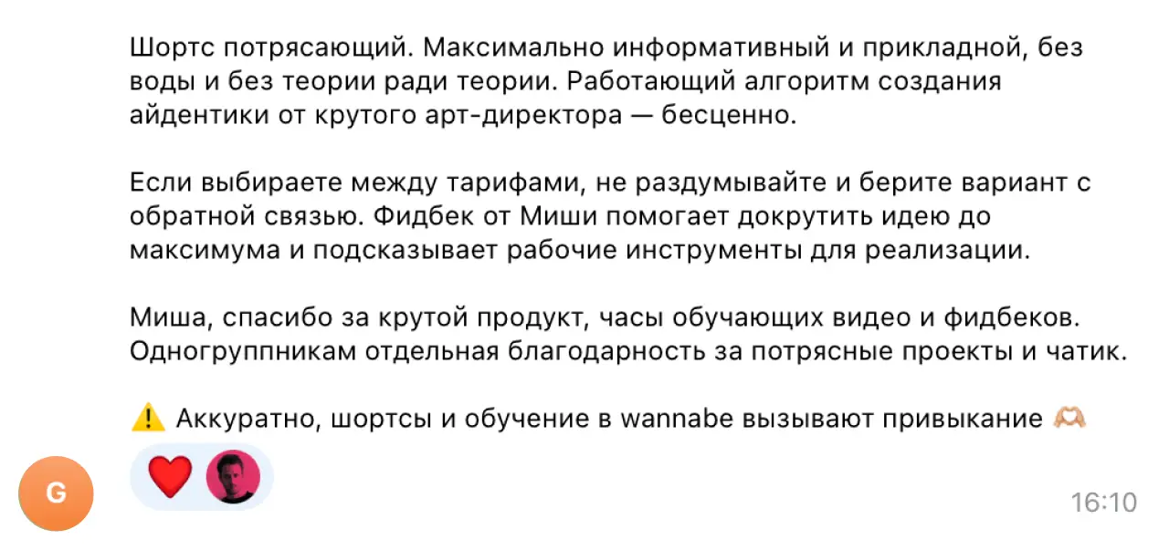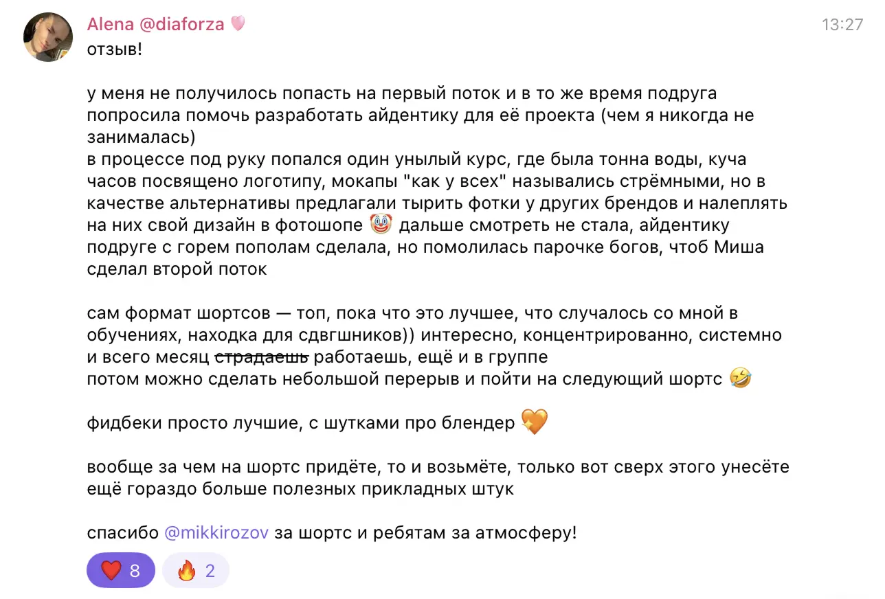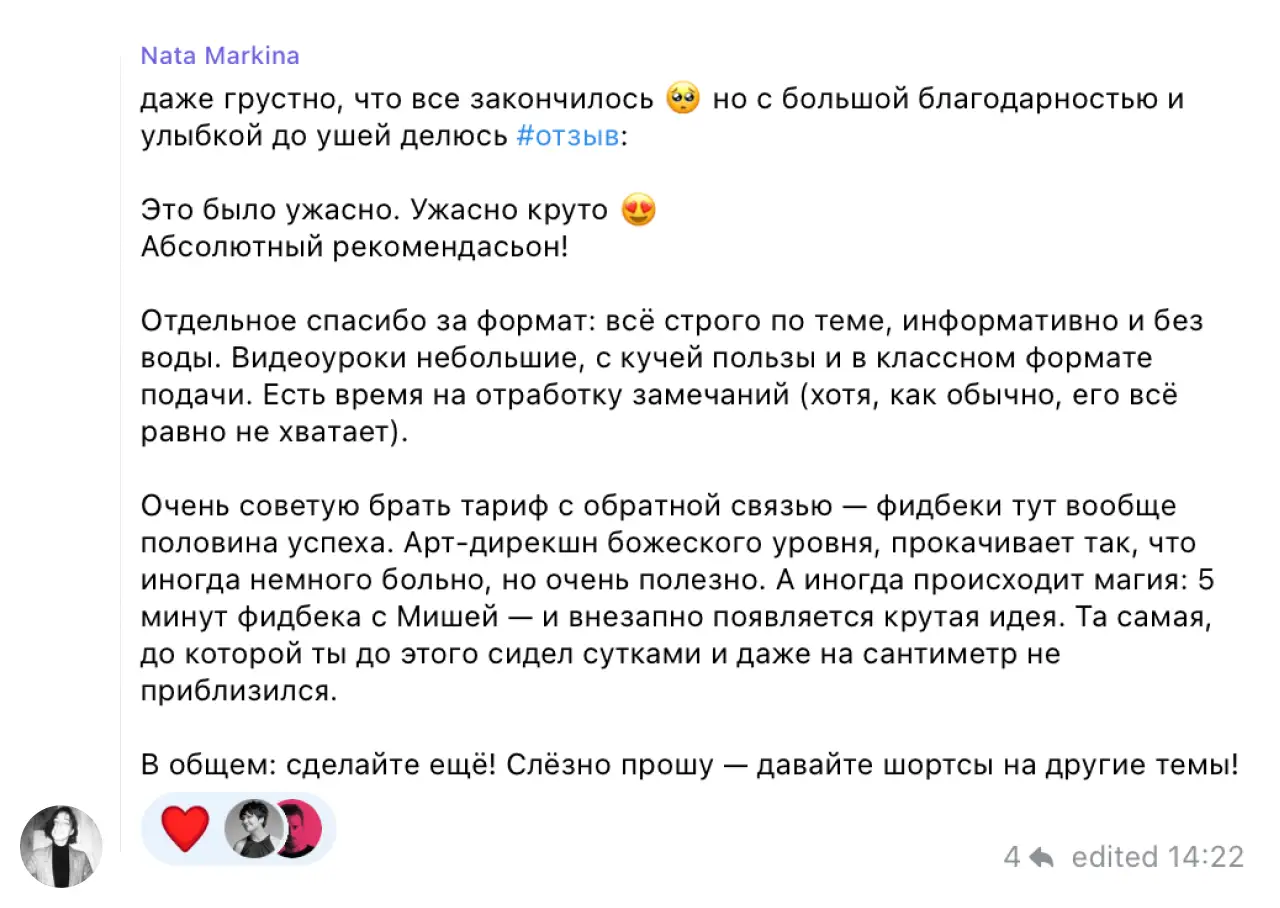 на шортсах особая атмосфера — 3 активных недели, короткие видео-уроки, фидбэки несколько раз в неделю, ежедневная поддержка в чате, каждый раз обновленная программа